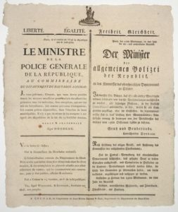 BAS-RHIN. 1798. COLMAR. Adresse de DONDEAU « Le Ministre de la Police générale de la République, au Commissaire du Département du Haut-Rhin, à Colmar. Paris le 25 Ventôse An 6 (15 Mars 1798) » Réponse de COLMAR le 29 Ventôse An 6. « Vous devez prendre toutes les mesures nécessaires pour exclure des assemblées primaires tous les individus, sans exception, qui ont été mis en surveillance, soit comme prévenus d’émigration, soit comme prêtres déportables… » Imprimerie de Jean-Henri Decker Fils. Vignette. Placard bilingue (35 x 42), Etat A.