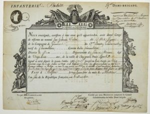 BELFORT (90). Général JACOPIN - CONGÉ MILITAIRE de Réforme au nommé Jean Guillaume CADET dit CADET Sergent de la Compagnie de GRENADIERS au 3° Bataillon du 57° DEMI-BRIGADE INFANTERIE DE BATAILLE, natif de FONTAINEBLEAU (SEINE ET MARNE) - Fait à BELFORT (90) 27 Messidor An 6 (15 Juillet 1798). Pièce signée JACOPIN Le Général de Brigade Commandant par intérim la 2ème Division du Corps du HAUT RHIN - 1p in-folio oblong, en partie gravée (24 x 32) - JACOPIN (Jean Baptiste) Brioude (Haute-Loire) 1755 - Épinal (Vosges) 1811 - Général en 1794, Député de la MEURTHE en 1802