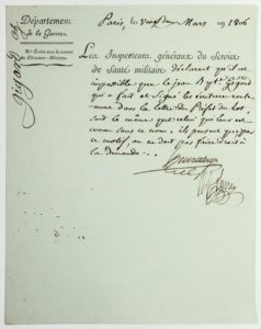 LARREY. Déclaration signée des Chirurgiens Dominique-Jean LARREY et Nicolas HEURTELOUP, Les Inspecteurs généraux du service de Santé militaire. Paris le 22 Mars 1806. 1 Page (23 x 18 cm). Dominique Jean LARREY (1766 - 1842) et Nicolas HEURTELOUP (Tours 1750-1812) sont Chirurgiens en Chef de la Grande Armée.