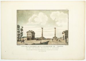 « Vue de l’entrée de LA BARRIÈRE DU TRÔNE ou de Vincennes, Faubourg St Antoine. » Chappuis sculpt. A Paris chez Esnaults, marchand d’Estampes, Boulevard Montmartre. Déposé à la Bibliothèque Impériale en 1807. (29 x 42 cm). Coloris anciens.