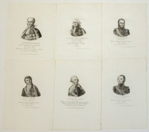 EMPIRE. LÉGION D’HONNEUR. 6 Gravures imprimées à Paris, rue des Franc-Bourgeois, N°6. (30 x 22 cm) : Étienne MACDONALD, Duc de Tarente, Maréchal de France, décoré de la Grand-Croix de la Légion d’Honneur + Charles OUDINOT, Duc de REGGIO, décoré de la Grand-Croix de la Légion d’Honneur + Jean-Gérard LACUÉE, Ministre d’Etat, Président du Conseil, Section de la Guerre, Décoré de la Grand-Croix de la Légion d’Honneur + Louis-Nicolas DAVOUT, Prince d’Eckmühl, Maréchal de France, Grand-Croix de plusieurs ordres + Charles François LEBRUN, Duc de Plaisance, Décoré du Grand-Aigle de la Légion d’Honneur + François Joseph LEFEBVRE, Duc de Dantzig, Maréchal de France, Décoré de la Grand-Croix de la Légion d’Honneur.