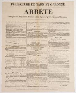 TARN-ET-GARONNE. MONTAUBAN, 21 Juillet 1813. « Arrêté relatif à une réquisition de divers objets à fournir à L’ARMÉE D’ESPAGNE. » Louis BOUVIER-DUMOLARD Préfet. Impr. À Montauban, Chez P.A. Fontanel. Liste des objets requis, et répartition entre les arrondissements : Farine de froment et de seigle, légumes secs, vivres viande, avoine chevaux et mules, dispositions générales : payement. Placard (53 x 42 cm) État B+