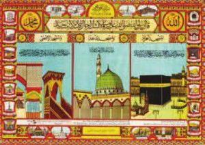 Certicat de Pélerinage sous la forme d’un tryptique représentant la Ka’Ba, la Rawdha et Al-Aksa surmonté d’un Hadith du prophète. Le présent pèlerinage était limité à ces trois mosquées. Les trois mos-quées sacrées sont entourées