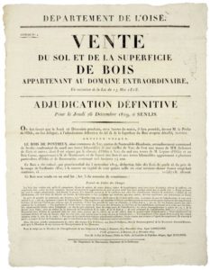 OISE. 1819. “VENTE du sol et de la superficie de BOIS appartenant au Domaine Extraordinaire. Adjudication définitive pour le 16 décembre 1819, à SENLIS ; savoir : LE BOIS DE PONTHEUX, situé Commune de VER, Canton de Nanteuil-le-Haudouin « Vente du sol et de la superficie de BOIS appartenant au Domaine Extraordinaire. » Extrait du cahier des charges. Fait et rédigé par le Directeur de l’enregistrement des Domaines Forêts, à BEAUVAIS, le 9 Novembre 1819. De l’imprimerie de Desjardins, Imprimeur de la Préfecture. Placard (54 x 40) État A