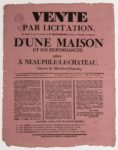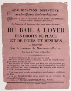 YVELINES. NEAUPHLE-LE-CHATEAU (78). 2 Affiches (46 x 35 cm) : Adjudication définitive, le 25 Novembre 1827, du Bail à loyer des DROITS DE PLACE et de POIDS ET MESURES à percevoir dans la Commune de Neauphle-le-Château, les jours de Foires et Marchés. S’adresser à Mr DESROSIERS père, Maire de la Commune 2° Et à Maitre MAHÉ-DESROSIERS fis, Notaire. De L’imprimerie de E. Chaignet, à Rambouillet + Vente d’une Maison et ses dépendances à Neauphle-le-Château, Canton de Montfort-L’amaury. Adjudication le 30 Octobre 1825. Imprimerie de Leroux à Rambouillet.