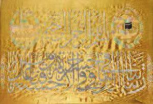 Souvenir de Pèlerinage. Peinture sur soie jaune avec deux médaillons polychromes représentant la Ka’aba et Médine, accompagnés d’un verset coranique, calligraphié à la peinture blanche pailletée de noir et d’argent. Dim. 46x67cm. à vue.