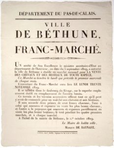 PAS-DE-CALAIS. 1829. « Ville de BÉTHUNE, FRANC-MARCHÉ. » Avis du Marquis DE BAYNAST Maire, à Béthune le 1er Octobre 1829. Ouverture d’un Franc-Marché pour la vente des Chevaux et Bestiaux de toute espèce. – Impr. à LILLE, chez Danel, Imprimeur du Roi et de la Préfecture. Placard (44 x 34,5) Etat A.