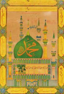 La «RAWDHA». Représentation du Mausolée du prophète à Médine. Peinture polychrome accompagnée d’une louange au prophète et de citations du Coran. Petits trous de ver, sans gravité. 65x45cm. à vue. Encadré.
