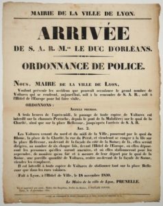 1830. MAIRIE DE LYON. “Ordonnance de police concernant L’ARRIVÉE de S.A.R. Mgr le DUC D’ORLÉANS.” Voulant prévenir les accidents que pourrait occasionner le grand nombre de Voitures qui se rendront, aujourd’hui, soit à la rencontre de S.A.R., soit à l’Hôtel de l’Europe pour lui faire visite...” - Le Maire de LYON Prunelle, Lyon 18 novembre 1830 - Impr. à LYON. Placard (53 x 41) État A.