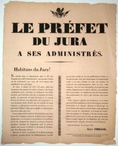 JURA. 1831. Adresse du Préfet du JURA, Léon THIESSÉ, à ses Administrés. LONS-LE-SAUNIER, le 26 Mai 1831 : « Habitants du JURA ! En arrivant dans ce département dont le Roi des Français (LOUIS-PHILIPPE) m’a confié l’administration, mon premier besoin est de m’entretenir avec vous… Je viens, la Charte de 1830 à la main, plein de souvenirs et des pensées des Journées de JUILLET, réclamer votre loyale coopération… » - Vignette au Coq « Honneur et Patrie » - Placard (53 x 43) État A
