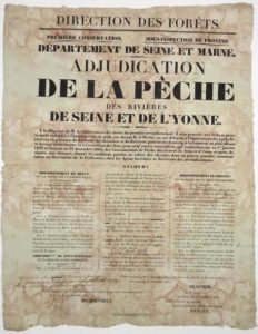 SEINE-ET-MARNE. 1831. Direction des FORÊTS. Sous-Inspection de PROVINS - “Adjudication de LA PÊCHE des Rivières de SEINE et de l’YONNE” (Arrondissement de MELUN; Arrondissement de FONTAINEBLEAU; Arrondissement de PROVINS.) - MELUN 25 Novembre 1831 - (marbrures importantes) - Impr. à PROVINS, Imprimerie de LEBEAU. Affiche (60 x 46) Etat D.