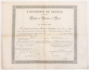 Comte de MONTALIVET (Marthe Camille Bachasson) Valence/Drôme 1801 – Château de Montalivet-Lagrange/ Cher 1880). Diplôme signée MONTALIVET en tant que Pair de France, Ministre de l’Instruction publique et des Cultes, Grand-Maître de l’Université, sur un Diplôme de Bachelier en Droit à son en-tête gravé. Paris le 24 Février 1832. Vélin gravé (44 x 35 cm), rempli à l’encre. Sceau sous papier. Joint ; Lettre signée MONTALIVET en tant que Pair de France, Intendant général de la Liste Civile, à Mr ROCHELLE, Paris 21 Janv. 1834, concernant des entrées accordées par le Roi au Théâtre français.