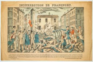 ALLEMAGNE. « INSURRECTION DE FRANCFORT. » le 3 Avril 1833. Image de la Fabrique de Pellerin, Imprimeur-Libraire à Epinal (Vosges). (42 x 64 cm). « Un Conspiration, dont des progrès rapides pouvaient s ‘étendre dans toute l’Allemagne, et y opérer une révolution générale, a éclaté à Francfort le 3 Avril 1833… Première tentative d’une révolution imminente contre le joug de fer de la Confédération germanique. »