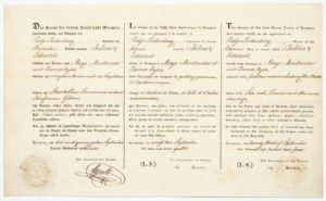 ALLEMAGNE. PATENTE DE SANTÉ délivrée par le Sénat de la Ville Hanséatique de BREMEN pour se rendre à MAYO, MONTÉVIDÉO et BUENOS AYRES du 23 Septembre 1834. Texte trilingue Français, Allemand, Anglais. Formulaire impr. rempli à l’encre (23 x 38,5) « … que Bremen et ses ports, son territoire et ses environs se trouvent à présent en état de parfaite santé et qu’ils n’y existent aucune épidémie, peste, choléra morbus, fièvre jaune ou autres maladies contagieuses… »