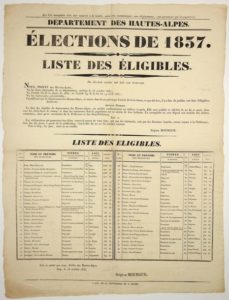 HAUTES-ALPES. Élections de 1837. Liste des ÉLIGIBLES - Arrêté de MOURGUE Préfet des Hautes-Alpes qui publie le Tableau des Listes des Éligibles du Département - Tableau - GAP 18 octobre 1837. Affiche (59 x 45) Etat A.