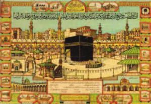 Certicat de pèlerinage montrant la Ka’aba, encadré de 22 vignettes représentant les 22 étapes des lieux saints. 44x65cm. à vue. Encadré.