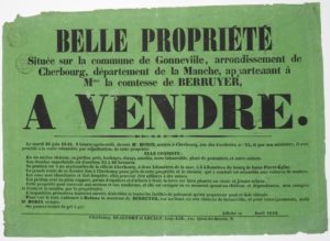 MANCHE. 1842. Comte de BERRUYER. Château de GONNEVILLE - Avril 1842. “Belle propriété située sur la Commune de GONNEVILLE, arrondissement de CHERBOURG, département de la Manche, appartenant à Mme la Comtesse de BERRUYER, à Vendre.” (Ancien Château de Gonneville, jardins, prés, herbages, étangs, moulin, ...) Cachet timbre royal - Impr. à CHERBOURG, chez BEAUFORT et LECAUD, Impr.-Lith., rue Quai-du-Bassin, 9. Affiche verte (30 x 42) État A.