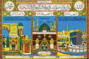 Certicat de pèlerinage. Tryptique représentant la Ka’aba, le Mausolée du prophète à Médine et la grande Mosquée. Image populaire comportant un cartouche en partie imprimé, que les pélerins remplissaient en yinscrivant leur nom et la date du