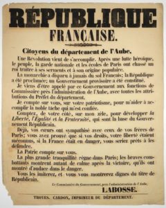 (AUBE. RÉVOLUTION DE FÉVRIER 1848). « RÉPUBLIQUE FRANÇAISE. Citoyens du Département de l’AUBE, une révolution vient de s’accomplir. Après une lutte héroïque, le peuple, la garde nationale et les écoles de Paris ont chassé le roi traître à ses serments et à son origine populaire. La monarchie a disparu à jamais du sol français ; LA RÉPUBLIQUE A ÉTÉ PROCLAMÉE ; un Gouvernement provisoire a été constitué… La Patrie compte sur vous… LABOSSE Le Commissaire du Gouvernement près l’administration de l’Aube. – Impr. à TROYES, chez Cardon Imprimeur du Département. Affiche (55 x 44) État B.