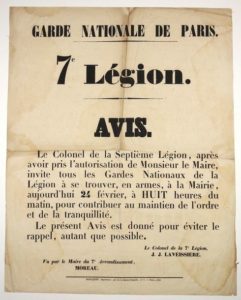 “GARDE NATIONALE DE PARIS”. 7e LÉGION. (RÉVOLUTION DE FÉVRIER 1848) « AVIS du Colonel J. J. LAVEISSIERE... après avoir pris l'autorisation de Monsieur le Maire (MOREAU) invite tous les Gardes Nationaux de la Légion à se trouver, en armes, à la Mairie, aujourd'hui 24 février, à huit heures du matin, pour contribuer au maintien de l'ordre et de la tranquillité... » - Paris Impr. BOUCQUIN rue de la Sainte-Chapelle. Affiche (44 x 56) État B.