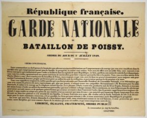 YVELINES. 1848. « GARDE NATIONALE du BATAILLON de POISSY. » – Ordre du Jour du 1er Juillet 1848, du commandant en Chef du Bataillon, LEGENDRE – « Chers Concitoyens,… sincères félicitations sur l’empressement et le courage que vous avez manifestés dans la terrible crise qui compromettait parmi nous la famille, la prospérité, la société toute entière. Vous avez été offrir.. votre concours à vos frères courageux qui combattaient pour l’ordre et la liberté dans la Capitale de notre république… Chers concitoyens du Bataillon de POISSY, soyez toujours ce que vous avez été dans ces graves circonstances !… Reconnaissance à M. Besançon,… en se plaçant, à Paris, à notre tête pendant la nuit du 24 au 25 juin (1848) … L’Armée fraternise avec nous… resserrons les liens qui nous unissent à elle et nous assurerons à notre république la prospérité… La Revue qui aura lieu demain, nous réunira tous en un seul faisceau… notre devise « Liberté, Egalité, Fraternité, Ordre public !!! » – Impr. à POISSY, chez G. Olivier - Affiche (55 x 43) État B