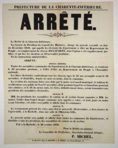CHARENTE-MARITIME. REMPLACEMENT DE LOUIS-NAPOLÉON-BONAPARTE - LA ROCHELLE, le 30 octobre 1848. Arrêté du Conseiller de Préfecture, Secrétaire-Générale délégué P. MICHEL pour le Préfet en tournée; qui appelle les électeurs du département à élire un Représentant du Peuple, en remplacement du Citoyen BONAPARTE, dont l'option a été régulièrement justifiée, et qui fixe les élections au 19 novembre prochain - Impr. La Rochelle, Typo. De DAUSSE et A. SIRET. Affiche (55 x 43) État A.