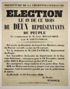 CHARENTE-MARITIME. ÉLECTION DU 19 NOVEMBRE 1848. LA ROCHELLE, le 15 Novembre 1848 - AVIS du Préfet WISSOCQ annonçant l'élection de deux Représentants du Peuple au lieu d'un, en remplacement de M. Louis BONAPARTE et de M. COUTANSEAU démissionnaire - Impr. La Rochelle Typo. De DAUSSE et A. SIRET - Affiche (55 x 43) État A