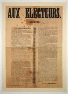 NAPOLÉON III. 1848. Adresse du Général MONTHOLON, « Aux Électeurs ». « Des ambitions personnelles s’attaquent avec acharnement à LOUIS NAPOLÉON BONAPARTE pour repousser sa Candidature… LOUIS NAPOLÉON est Français… Pour la Mémoire de l’Empereur Napoléon 1er… J’ai partagé les sept ans de captivité qu’il a enduré dans la forteresse de HAM… » (Décembre 1848) – Impr. de Mme Lacombe, 12 rue d’Enghien. Affiche (60 x 41) État B, Entoilée.