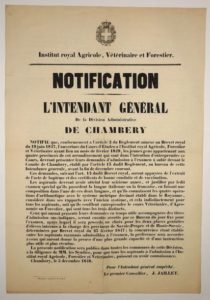 SAVOIE. 1848. « INSTITUT ROYAL, VÉTÉRINAIRE ET FORESTIER » - CHAMBÉRY 5 déc. 1848. Notification de l'Intendant Général de la Division Administrative de CHAMBERY pour l'ouverture aux droits d'examen du Cours d'Etudes à l'Institut Royal Agricole, Forestier et Vétérinaire au mois de février 1849 - Impr. PUTHOD à Chambéry. Affiche (44 x 63) État A.