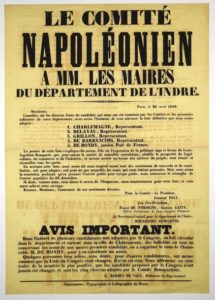 INDRE. 1849. "LE COMITÉ NAPOLÉONIEN", A MM. LES MAIRES DU DÉPARTEMENT DE L'INDRE - Adresse des membres du Comité (Général PIAT, Fialin DE PERSIGNY, Armand LAITY et BOURGEOIS D'ORVANNE) qui a l'honneur d'annoncer la liste définitive adoptée par le Congrès pour le Département de l'INDRE: "CHARLEMAGNE, Représentant; DELAVAU, Représentant; GRILLON, Représentant; DE BARBANÇOIS, Représentant; DE BONDY, Ancien Pair de France" - PARIS, le 26 avril 1849 - CHATEAUROUX, Typ. et Lith. De MIGNE. Affiche jaune (62 x 44) État A.