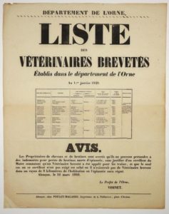 ORNE. 1849. “LISTE des VÉTÉRINAIRES Brevetés établis dans le Département de l’ORNE, au 1er Janvier 1849.” (en Tableau: Nom, résidence, date du diplôme, École d’Alfort) - suivi de l’Avis du Préfet de l’Orne VISINET, ALENÇON 16 mars 1849 - concernant les Propriétaires de chevaux ou bestiaux qui prétendent à l’indemnité pour pertes de bestiaux morts d’épizootie. Affiche (46 x 37) État A.