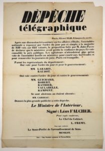 YONNE. DÉPÊCHE TÉLÉGRAPHIQUE signé Léon FAUCHER Ministre de l'Intérieur - Paris, 12 mai 1849, 9 heures du matin. "Après une discussion très animée sur les affaires d'Italie (Campagne de ROME), l'Assemblée Nationale a repoussé par l'ordre du jour pur et simple, à la majorité de 329 voix sur 621 votants, la proposition faite par M. Jules FAVRE de déclarer que le ministère avait perdu la confiance du pays. Ce vote consolide la Paix Publique. Les agitateurs n'attendaient plus qu'un vote de l'Assemblée hostile au ministère pour courir aux barricades et pour renouveler les journées de juin; Paris est tranquille...Parmi les Représentants du Département (de l'YONNE): Ont voté pour MM. LARABIT, RAUDOT; Ont voté contre MM. GUICHARD, ROBERT, RATHIER, VAULABELLE et RAMPONT..." – à SENS, Impr. DUCHEMIN, successeur de Thomas-Malvin. Affiche (45x62) Etat A.