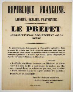 VIENNE. RHÔNE. RÉPRESSION DES OUVRIERS DE LA CROIX-ROUSSE A LYON - Adresse du Préfet aux habitants de la VIENNE "Le Gouvernement a fait connaitre à l'Assemblée législative,.. .que l'ordre avait été maintenu dans tous les départements, sauf à LYON, où une insurrection avait éclaté...Le préfet du Rhône annonce..., à la date du 16, à 9h du matin, que l'insurrection de LYON est vaincue et que tout y est terminé..."- POITIERS, le 17 juin 1849 - Affiche (44x56) État A.