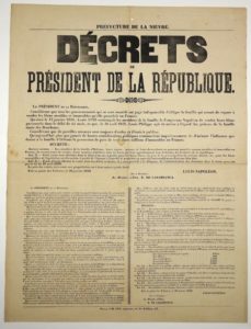 NIÈVRE. COUP-D'ÉTAT DU 2 DÉCEMBRE 1851. VENTE DES BIENS DE LA FAMILLE D'ORLÉANS CRÉATION DE LA MÉDAILLE MILITAIRE - Décrets du Président de la République du PALAIS DES TUILERIES, le 22 janvier 1852 "Considérant que tous les gouvernements qui se sont succédé ont jugé indispensable d'obliger la famille qui cessait de régner à vendre les biens meubles et immeubles qu'elle possédait en France; Qu'ainsi le 12 janvier 1816, Louis XVIII contraignit les membres de la famille de l'empereur Napoléon de vendre leurs biens personnels dans le délai de 6 mois, et que, le 10 avril 1832, Louis-Philippe agit de même à l'égard des princes de la famille ainée des Bourbons; Considérant que pareilles mesures sont toujours d'ordre et d'intérêt publics...Les biens faisant retour à l'Etat...seront vendus en partie à la diligence de l'administration des domaines, pour le produit en être réparti ainsi...Dix millions sont alloués aux sociétés de secours mutuels...Dix millions seront employés à l'améliorer les logements des ouvriers...Dix millions seront affectés à l'établissement d'institutions de crédit foncier...Cinq millions serviront à établir une caisse de retraite...Le surplus...sera réuni à la dotation de la Légion-d’Honneur... Il est créé une médaille militaire donnant droit à cent francs de rente viagère en faveur des soldats l'armée de terre et de mer...Le Château de SAVERNE sera restauré..." - Affiche (66 x 50) - NEVERS, Impr. I.M. FAY - État A.