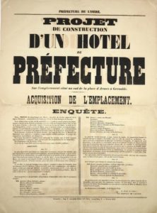 ISÈRE (GRENOBLE) - PROJET DE CONSTRUCTION D'UN HÔTEL DE PRÉFECTURE sur l'emplacement situé au sud de la place d'armes à GRENOBLE (38) - Acquisition de l'Emplacement - Enquête de M. LE PROVOST DE LAUNAY Préfet de l'ISÈRE - GRENOBLE, le 1er février 1858 - Grenoble, Impr. F. ALLIER. Affiche (46x62) Etat A