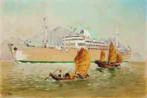 Delfo Yves. Le «Cambodge» en mer du Japon. Gouache signée en bas à gauche. Circa 1953. 40x59cm.