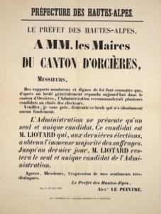HAUTES-ALPES – GAP 10 Juin 1861. Alexandre LE PEINTRE « Le Préfet des Hautes-Alpes, à MM. Les Maires du Canton d’ORCIÈRES. » « … L’Administration ne présente qu’un seul et unique Candidat. Ce candidat est M. LIOTARD qui, aux dernières élections, à obtenu l’immense majorité des suffrages… » - Impr. de P. Jouglard, Imprimeur de la Préfecture à GAP. Affiche (47 x 36) État A.
