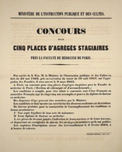 FACULTÉ DE MÉDECINE DE PARIS : « Concours pour 5 places d’Agrégés stagiaires près la Faculté de Médecine de Paris (Section de Chirurgie et d’accouchements). » Affiche du Ministère de l’Instruction publique et des cultes – Imprimerie Impériale, Janvier 1863. Affiche (59 x 44) État A