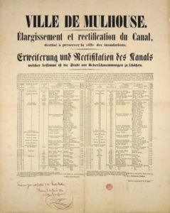 HAUT-RHIN. 1864. “Ville de MULHOUSE (68)” 8 Janvier 1864 - Élargissement et rectification du CANAL, destiné à préserver la ville des inondations. (Tableau des propriétaires expropriés) Le Maire Jean DOLLFUS - Impr. à Mulhouse, chez J.P. RISLER – Affiche (55 x 44) État A.