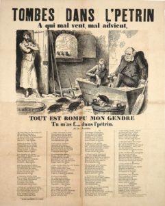(LES CAFARDS) « TOMBÉS DANS L’PÉTRIN, à qui mal veut, mal advient. Tout est rompu mon Gendre, tu m’as foutu dans l’pétrin. » Chanson populaire avec moralité, air de Fualdès. (Second Empire) – Illustration de DONJEAN – En vente : Chez Baudot, 20 rue Damat. – Typ. A. DAVY, 52 rue Madame à Paris. Affiche (55 x 44) État B