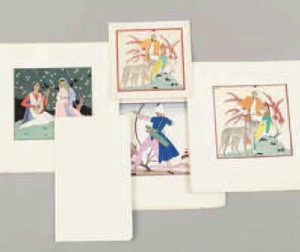 Salcedo Maggie (1890-1959). Artiste peintre et illustratrice française de style Art déco. Ensemble de trois aquarelles originales dont deux sont signées, sur fort papier d’Arches. L’une d’entre elles est accompagnée de l’exemplaire imprimé,
