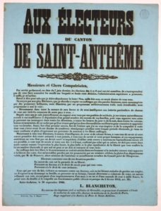 PUY-DE-DÔME (SAINT-ANTHÈME) 1866. AUX ÉLECTEURS DU CANTON DE SAINT-ANTHEME - Nouvelle adresse Électorale de L. BLANCHETON médecin et Juge suppléant à la justice de Paix de Saint-Anthème suite à l'annulation des élections du 5 et 6 mai dernier par le préfet - SAINT-ANTHEME, le 30 septembre 1866. Affiche bleue (62 x 47) État A.