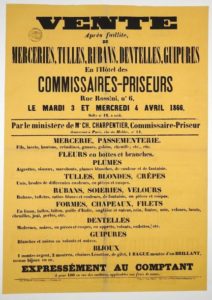 (PARIS. Vente aux enchères Rue ROSSINI, 1866) – « VENTE, après faillite, de MERCERIES, TULLES, RUBANS, DENTELLES, GUIPURES en l’Hôtel des Commissaire Priseurs, 6 rue Rossini, le 3 et 4 Avril 1866… (Mercerie, Passementerie, Fleurs, Plumes, Tulles, Blondes, Crêpes, Rubans, Soieries, Velours, Formes, Chapeaux, Filets, Dentelles, Guipures, Bijoux : montres, bague… » - Lith. Lutton, rue Notre-Dame des Victoires, 42. Affiche timbrée jaune (60 x 43) État B