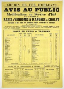 « CHEMIN DE FER D’ORLÉANS. » 1867 : « Avis au Public. Modifications au Service d’Été sur les Lignes de PARIS à VENDÔME et d’ANGERS à CHOLET. Création d’un train de Banlieue entre ANCENIS et NANTES le 1er Juillet 1867 » Paris le 22 Juin 1867. (Noms des Stations et Horaires d’Omnibus qui traversent l’Essonne, le Loiret, l’Eure et Loir, la Sarthe et le Maine-et-Loire.) - Affiche (42 x 60) État A