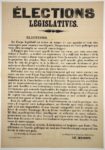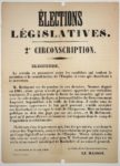 CHARENTE-MARITIME. 3 Affiches sur les Élections de 1869 : LA ROCHELLE (17) 15 mai 1869 « ÉLECTIONS LÉGISLATIVES.» « Électeurs, Le Corps Législatif est arrivé au terme de son mandat et vous êtes convoquer pour nommer vos Députés… L’EMPIRE que vous avez appelé de tous vos vœux, que vous avez contribué à fonder, a réalisé vos espérances… Défendez par vos votes un Gouvernement qui est votre œuvre ; ... Repoussez les candidats qui ne représenteraient pas vos convictions et vos intérêts, et tous ceux qui sont hostiles à nos institutions… » LE MASSON Le Préfet de la Charente-Inférieure - Impr. La Rochelle, typ. de G. Mareschal. Affiche (74 x 52) État A + LA ROCHELLE 21 Mai 1869 « ÉLECTIONS LÉGISLATIVES, 2ème Circonscription. » « Électeurs, Le Scrutin va prononcer entre les candidats qui veulent le maintien et la consolidation de l’Empire et ceux qui cherchent à le renverser. M. BETHMONT est du nombre de ces derniers. Nommé Député en 1865,… il a pendant toute la durée de son mandat, agi et voté avec les adversaires déclarés et irréconciliables du Gouvernement Impérial… Habitants d’un département qui, l’un des premiers, a acclamé le retour des Napoléons, vous n’aviez certainement pas cru envoyer au Corps Législatif un ennemi de l’Empire. Mieux éclairés cette fois, vous ne voudrez plus voter pour M. BETHMONT qui déjà n’a été réélu ni au conseil municipal de Rochefort ni au Conseil général. » – Impr. La Rochelle, typ. De G. Mareschal. Affiche (65 x 46) État B + ÉLECTIONS LÉGISLATIVES du 23 et 24 mai 1869 - Arrêté du Préfet LE MASSON portant sur l'organisation du futur scrutin - LA ROCHELLE, Mai 1869 - Impr. de G. MARESCHAL. Affiche (56 x 44) État A.
