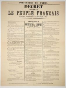 AUBE. SÉNAT. LA CONSTITUTION DE L'EMPIRE de 1870 « Décret convoquant le Peuple Français dans ses comices pour le Dimanche 8 Mai 1870 pour accepter ou rejeter le projet du Plébiscite. SENATUS-CONSULTE FIXANT LA CONSTITUTION DE L’EMPIRE voté par le SÉNAT dans la séance du 20 Avril 1870. » « L’Empereur est le Chef de l’Etat. » Pour copie conforme le Préfet de l’Aube BOYER-Ste-SUZANNE. - TROYES, Impr. BERTRAN-HU, 10 Place de l’Hôtel de Ville. Affiche (62 x 48) Etat B.