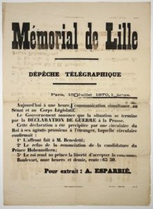 (DÉCLARATION DE LA GUERRE 1870.) “MÉMORIAL DE LILLE”. DÉPÈCHE TÉLÉGRAPHIQUE, PARIS 15 juillet 1870 à 1 heure "Aujourd'hui à une heure, communication simultanée au Sénat et au Corps Législatif. Le Gouvernement annonce que la situation se termine par la Déclaration de Guerre à la PRUSSE. Cette déclaration a été précipitée par une circulaire du Roi à ses Agents prussiens à l'étranger, laquelle circulaire confirmait: 1°) L'affront fait à M. BENEDETTI; 2°) Le refus de la renonciation de la Candidature du Prince HOHENZOLLERN; 3°) Le Roi rend au Prince la Liberté d'accepter la Couronne...Pour Extrait: A. ESPARBIE..." Affiche (62 x 45) État B