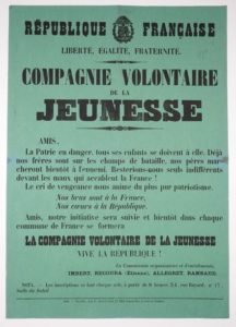 GRENOBLE (Isère). « COMPAGNIE VOLONTAIRE DE LA JEUNESSE » (Octobre 1870) : « Amis, LA PATRIE EST EN DANGER, tous ses enfants se doivent à elle. Déjà nos frères sont sur le champ de bataille, nos pères marcheront bientôt à l’ennemi. Resterions-nous seuls indifférents devant les maux qui accablent la France ! Le cri de vengeance nous anime du plus pur patriotisme. Nos bras sont à la France, Nos Cœurs à la République… » - La Commission organisatrice et d’enrôlements. Imbert, Recoura, Allegret, Rambaud. 17 rue Bayard, salle du Soleil. – Impr. à Grenoble, chez F. Allier père et fils, 8 Grande Rue, cour des Chaulnes. Affiche (62 x 42) État A