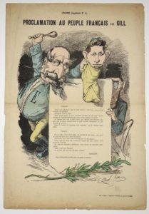 GILL. « PROCLAMATION AU PEUPLE FRANÇAIS par GILL ». L’Éclipse (Supplément N°4) : « …Français. Si j’ai signé, d’un cœur léger, la capitulation de SEDAN, c’est pour ne pas contrarier mon frère GUILLAUME ; C’est aussi parce que nous n’avions plus de chassepots… » NAPOLÉON III (octobre 1870) – Imprimerie Vallée, 16 rue du Croissant à Paris. Affiche (49 x 38) État B