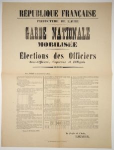 TROYES, le 20 Octobre 1870 – Préfecture de l’AUBE – « GARDE NATIONALE MOBILISÉE - Élections des Officiers, Sous-Officiers, Caporaux et Délégués. » (Organisation par Communes) - Arrêté du Préfet de l’Aube LIGNIER – Typo. Bertrand-Hu, Imprimeur de la Préfecture. Affiche (69 x 53) État A